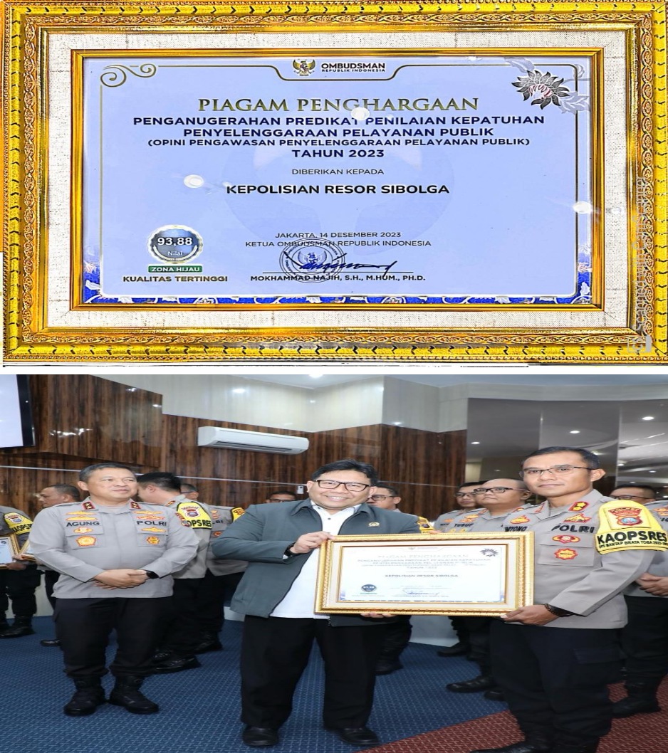 Dalam Penilaian Pelayanan Publik ini, Polres Sibolga berhasil mendapatkan Predikat Kepatuhan Tertinggi dalam Penilaian Kepatuhan Penyelenggaraan Pelayanan Publik Tahun 2023, dengan nilai 93.88 dan masuk Zona Hijau Kategori A dengan Opini Kualitas Tertinggi dari Ombudsman RI.