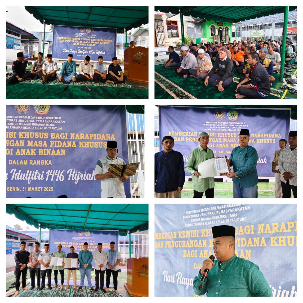 TAPUT – // Jurnalis.online // Bertempat di lapangan serba guna Rutan Kelas IIB Tarutung, kegiatan diawali dengan melaksanakan Sholat Led yang dipimpin oleh Ustad Mulyadi Siregar dari Kantor Kementerian Agama Kabupaten Tapanuli Utara. Dilanjutkan dengan Pembacaan Surat Keputusan Menteri Imigrasi dan Pemasyarakatan Republik Indonesia, Bapak Agus Andrianto serta Penyerahan Remisi Khusus Idul Fitri 1446 H kepada Narapidana secara simbolis oleh Kepala Rutan Kelas IIB Tarutung, Evan Yudha Putra Sembiring didampingi Kasubsi Pelayanan Tahanan, Jonias B.Pakpahan, Kasubsi Pengelolaan, Mian Simarmata, Kepala Kesatuan Pengamanan Rutan (Ka.KPR), James Bond Naibaho beserta staf dan Petugas Pengamanan, Senin (31/03/2025).