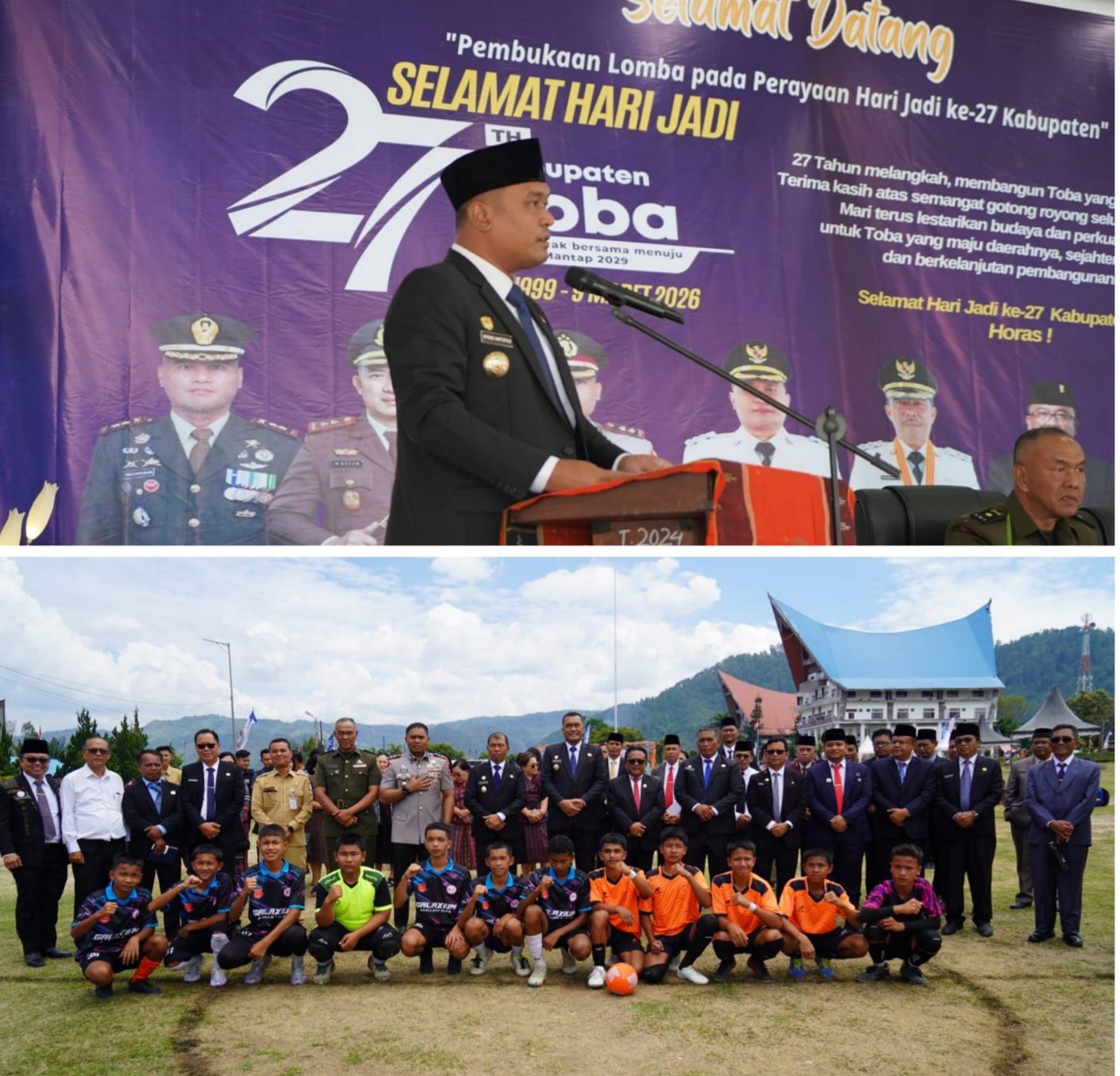 Bupati Toba Effendi Sintong P. Napitupulu didampingi Wakil Bupati Toba Audi Murphy O. Sitorus dan jajaran Forkopimda, membuka pertandingan futsal antar pelajar pada Perayaan HUT ke-27 Kabupaten Toba. Bertempat di Pendopo Rumah dinas Bupati Toba, Senin (9/3/2026).