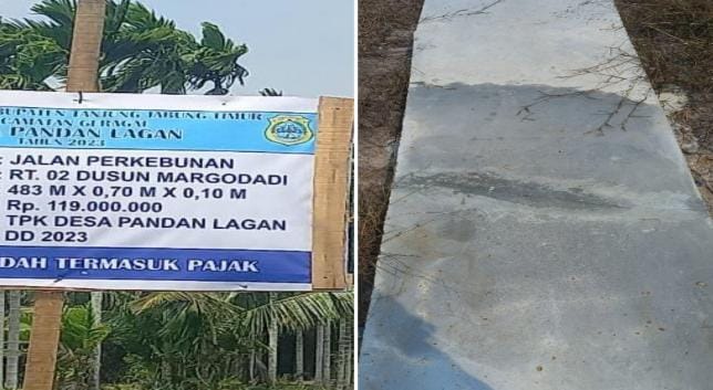Kegiatan dengan Jalan Perkebunan, lokasi Rt 02 Dusun Margodadi, volume 483M x 0,70M x 0,10M, jumlah Dana Rp. 119.000.000. Dana Desa tahun anggaran 2023 ini terlihat di lokasi sudah mengalami beberapa titik keretakan, tentunya hal ini patut diduga ada nya kekurangan kwalitas atau pun bisa diduga meterial nya dimainkan.