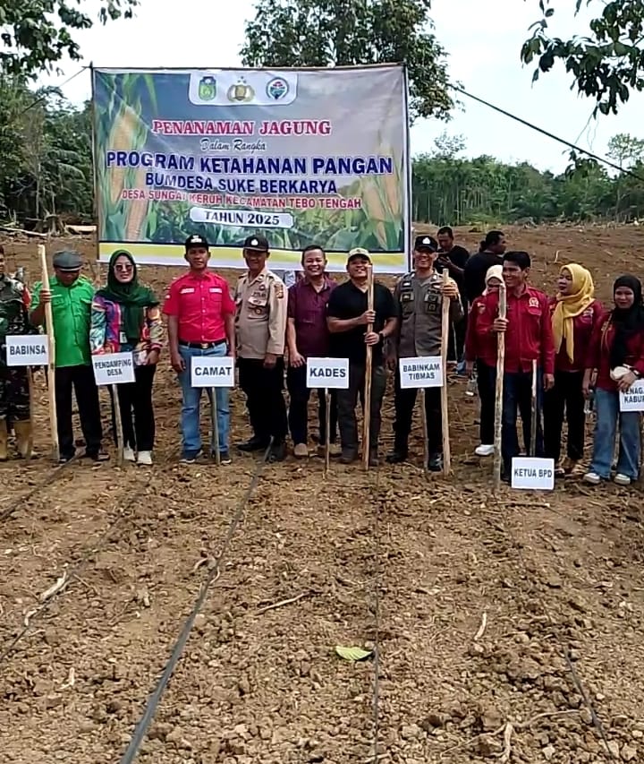 Penanaman jagung tersebut dihadiri oleh Camat Tebo Tengah, Mashuri, S.ST, bersama Kepala Desa Sungai Keruh, Alifman. Kehadiran sejumlah tokoh masyarakat dan aparatur desa membuat suasana kegiatan penuh semangat kebersamaan.