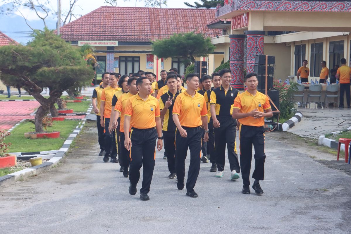 Kegiatan olahraga pagi dipimpin langsung Kapolres Toba AKBP V.J. Parapaga, S.I.K., diikuti para PJU dan anggota Polres Toba.