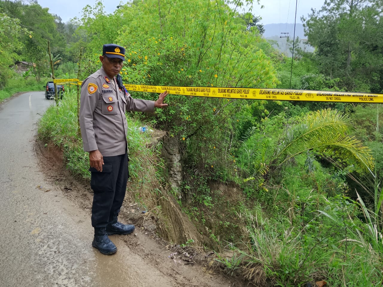 Kapolsek Silaen AKP Pargaulan Manurung, SH, beserta Anggota memantau Jalan longsor sekaligus memasang Police line di lokasi Jalan longsor bersama dengan Warga di Jalan lintas Umum Silaen – Parsoburan Kabupaten Toba Provinsi Sumatera Utara, Rabu (26/11/2025).