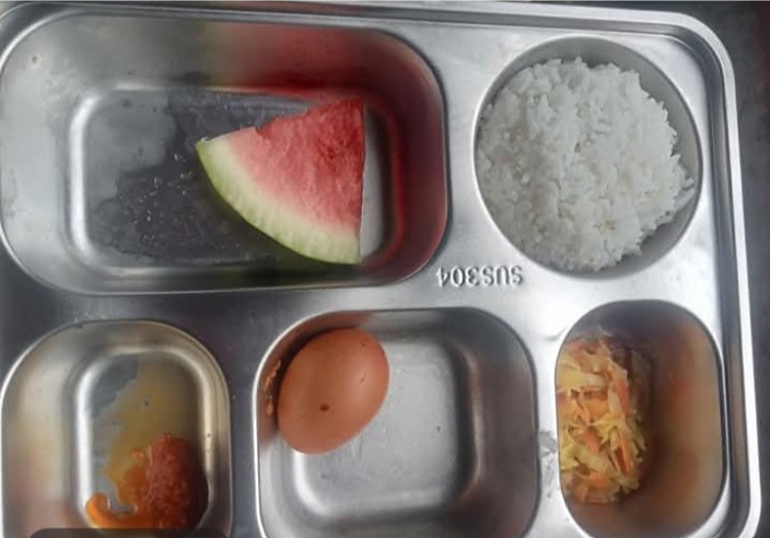 Dalam foto yang diunggah oleh akun facebook bernama Ken Aroz, terlihat sajian makan yang diletakkan di atas wadah logam (ompreng) bersekat.