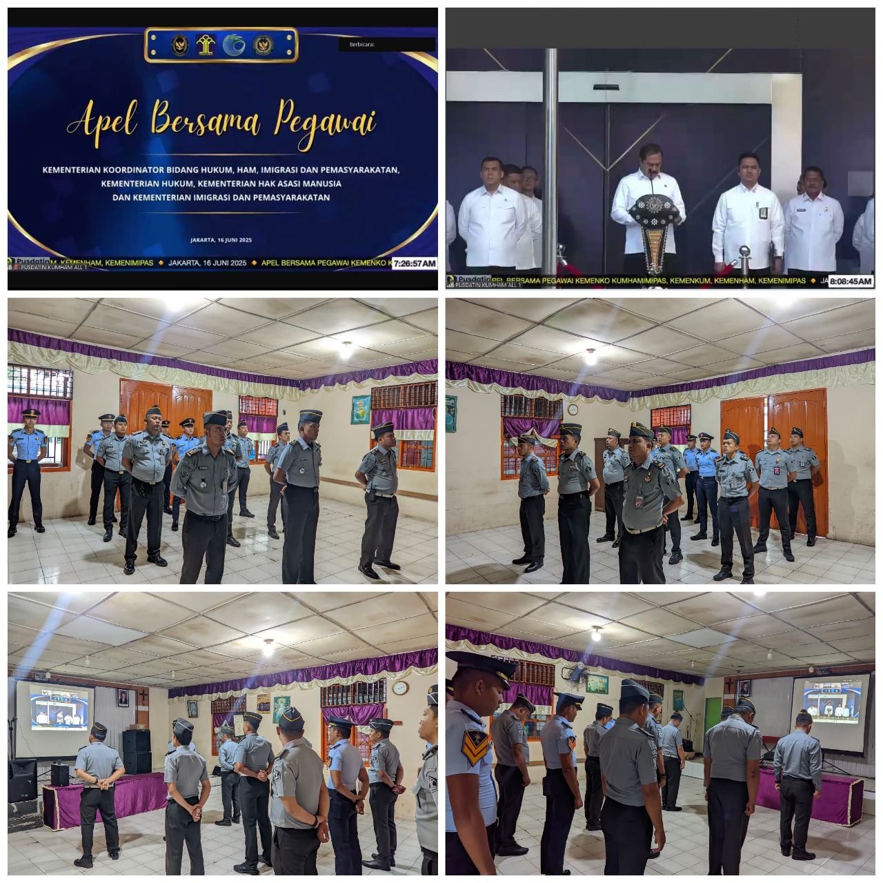 Taput – // Jurnalis.online // Rumah Tahanan Negara Kelas IIB Tarutung mengikuti Apel Pegawai Bersama di lingkungan Kementerian Koordinator Bidang Hukum, Hak Asasi Manusia, Pemasyarakatan dan Imigrasi, Kementerian Hukum, Kementerian HAM, Kementerian Imigrasi dan Pemasyarakatan secara virtual, Senin (16/6/2025).