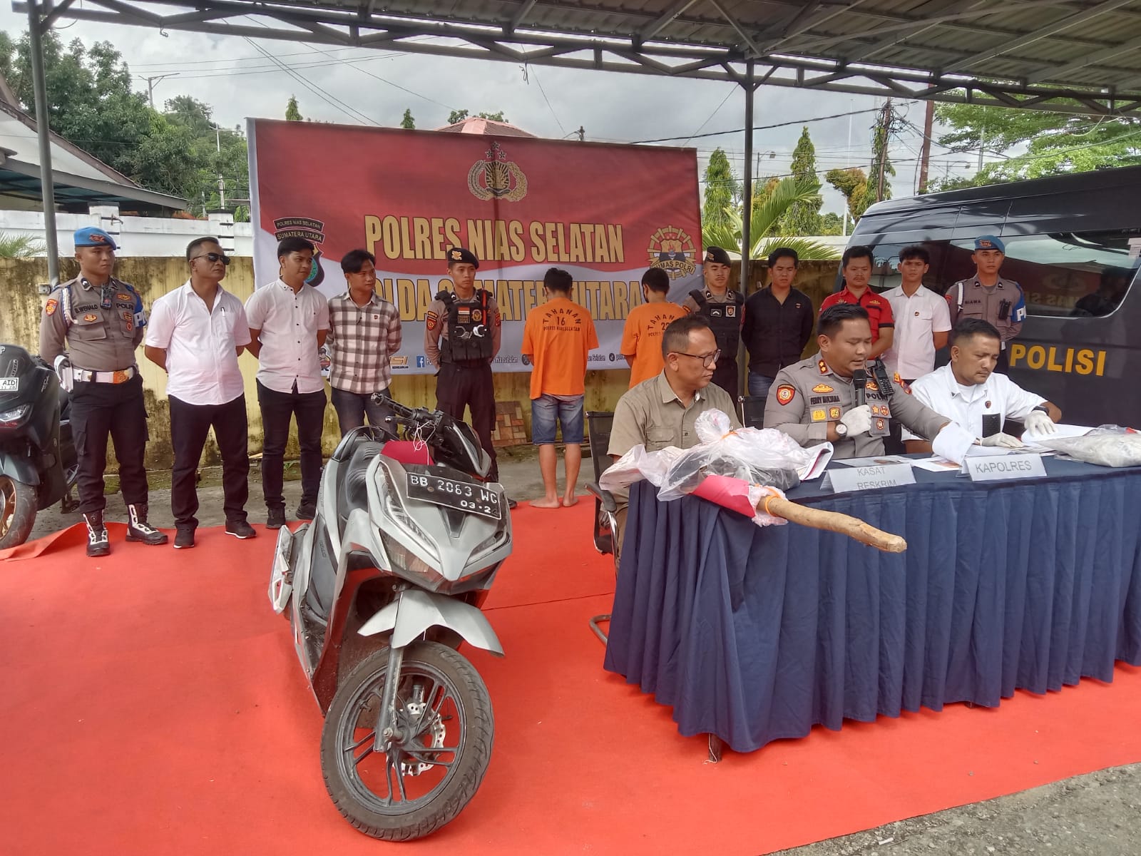 Kapolres Nias Selatan, AKBP Ferry Mulyana Sunarya, S.I.K., dalam konferensi pers di Mapolres Nias Selatan, pada Rabu (10/09/2025). menjelaskan bahwa pelaku berinisial FN alias Ama Ife telah diamankan setelah sempat melarikan diri. “Tersangka melakukan penembakan karena merasa terganggu kabel listrik milik korban yang melintas di teras rumahnya dan tidak dilepaskan,” ujar Kapolres.
