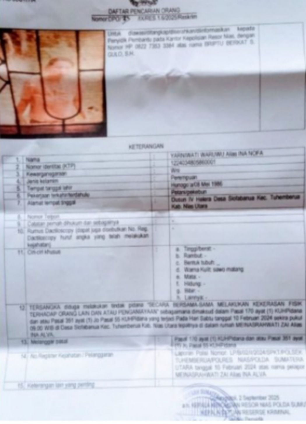 Penerbitan DPO tersebut tertuang dalam surat Nomor : DPO/33/IX/RES.1.6/2025/Reskrim berdasarkan Laporan Polisi Nomor : LP/B/02/II/2024/SPKT/Polsek Tuhemberua/Polres Nias/Polda Sumatera Utara tanggal 10 Februari 2024 atas nama pelapor Meinasrahwati Zai Alias Ina Alva.