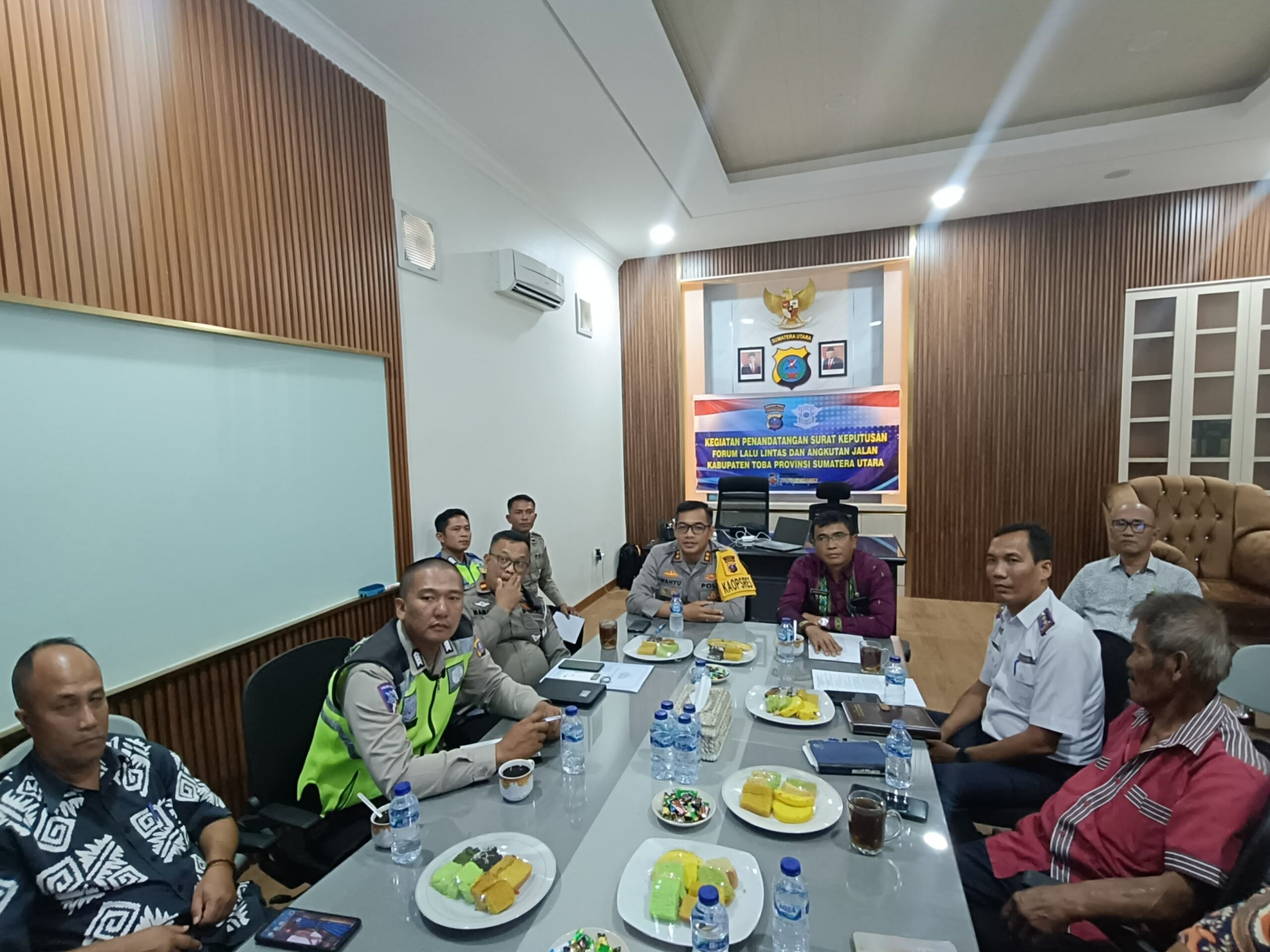 Turut hadir dalam zoom Penandatanganan Serentak Surat Keputusan Forum Lalu Lintas Dan Angkutan Jalan di Polres Toba Kapolres Toba AKBP Wahyu Indrajaya SH, S.I.K, Sekda Kabupaten Toba Drs Augus Sitorus, Kasat Lantas Polres Toba Iptu Nanang Kusumo, Kabid Lalu Lintas dan Jalan Dinas Perhubungan Kabupaten Toba Rudi Manik, Kabid PIKP Diskominfo Toba Rikardo Simamora, Pemerhati Lalu Lintas Kabupaten Toba Daniel Roymanto Manurung, Ketua Organda Kabupaten Toba Bapak Poyo, Ps. Kaurmintu AIPDA Roy Pasaribu, Ps. Kanit Turjawali Polres Toba BRIPKA Pelita Butarbutar, Ps. Kanit Kamsel Polres Toba BRIPKA Johanes Sembiring, Ps. Kanit Laka Polres Toba BRIPKA Robinson Aritonang, PUTR Kabupaten Toba Seksianton Hutabarat, Personil Satlantas Polres Toba dan Personil Dinas Perhubungan Kabupaten Toba.