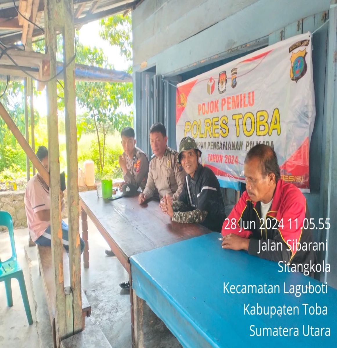 TOBA – // Jurnalis.online // Personil Polsek Laguboti Polres Toba Aiptu P Pardede dan Bripda Lasmon Gultom, melaksanakan Kegiatan Pojok Pemilu dalam rangka bersama-sama Ciptakan Pilkada Damai Tahun 2024. Bersama masyarakat di Desa Sibarani Sitangkola Kecamatam Laguboti Kabupaten Toba Provinsi Sumatera Utara, Jumat (28/06/2024) sekira pukul 11.00 Wib.