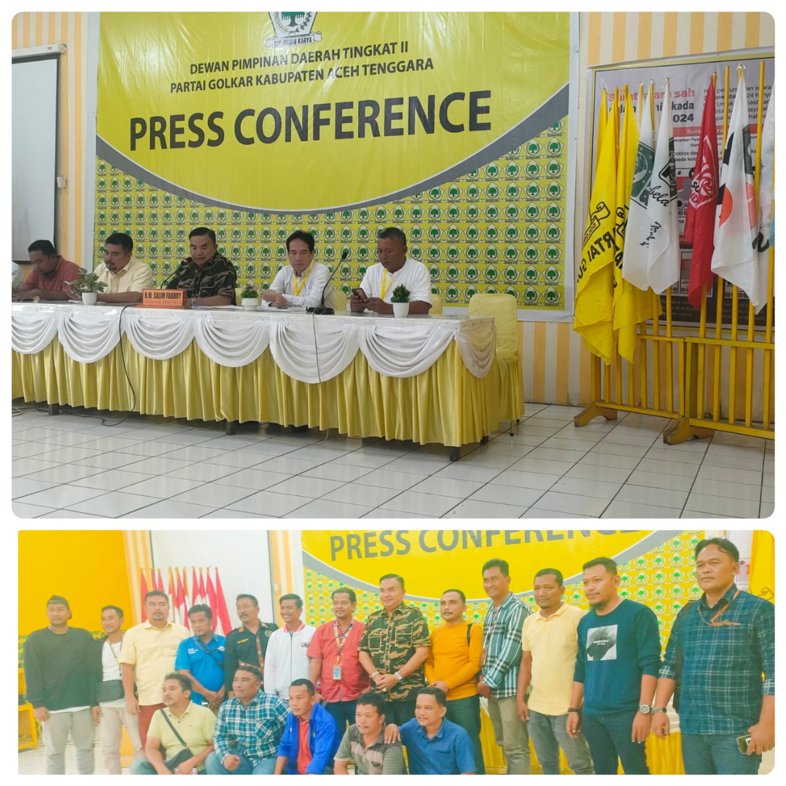 KUTACANE – // Jurnalis.online // Bupati terpilih Paslon nomor urut satu HM. Salim Fakhry – Dr Heri Al Hilal (SAH), menggelar konferensi pers terkait perolehan suara di Pilkada Aceh Tenggara, di Aula kantor Golkar setempat, Selasa (03/12/2024).